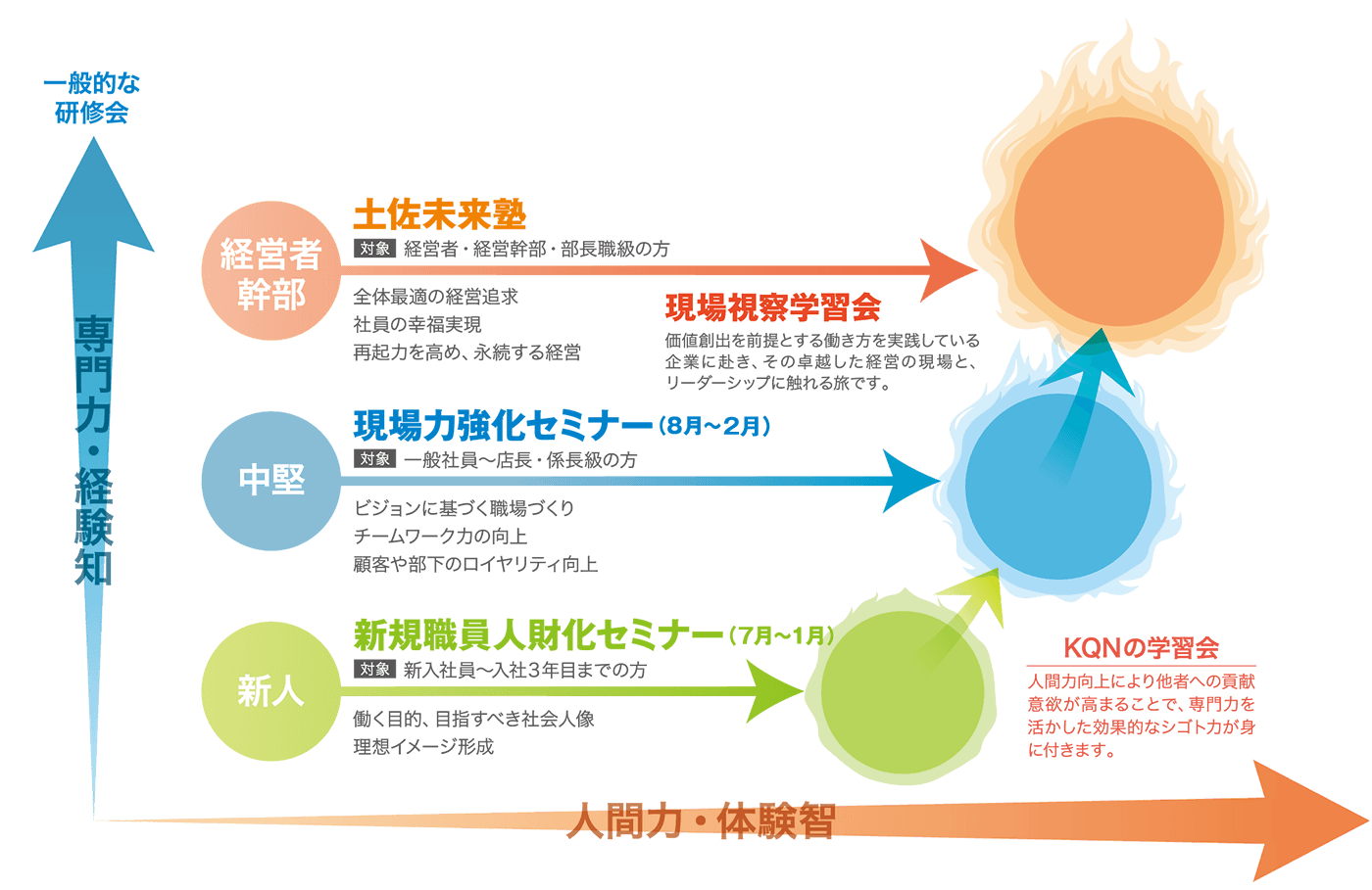 一方、KQNは研修会とは趣旨の異なる「學習会」を企画し、ご提供することに努めて参りました。KQN學習会は、有意義な人生を送るために、同僚やお客様と接する中でいかなる価値創造をしていくのか…といった、本質的な「考え方」の整理をお手伝いします。